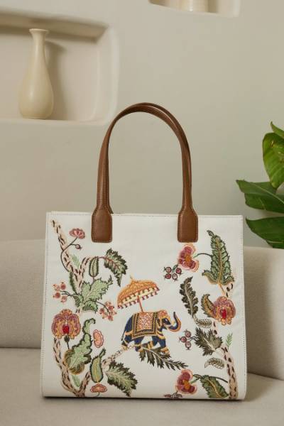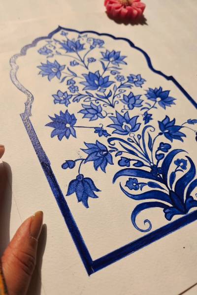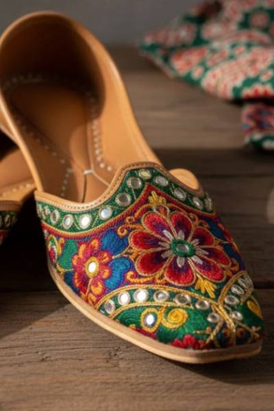 Each ornament begins with spools of golden zari thread, drawn and prepared by hand. The fabric is then stretched across a traditional Adda frame, where artisans patiently weave in pearls, sequins, and metallic wires using centuries-old techniques. Layer by layer, the design comes to life – every stitch precise, every detail intentional.